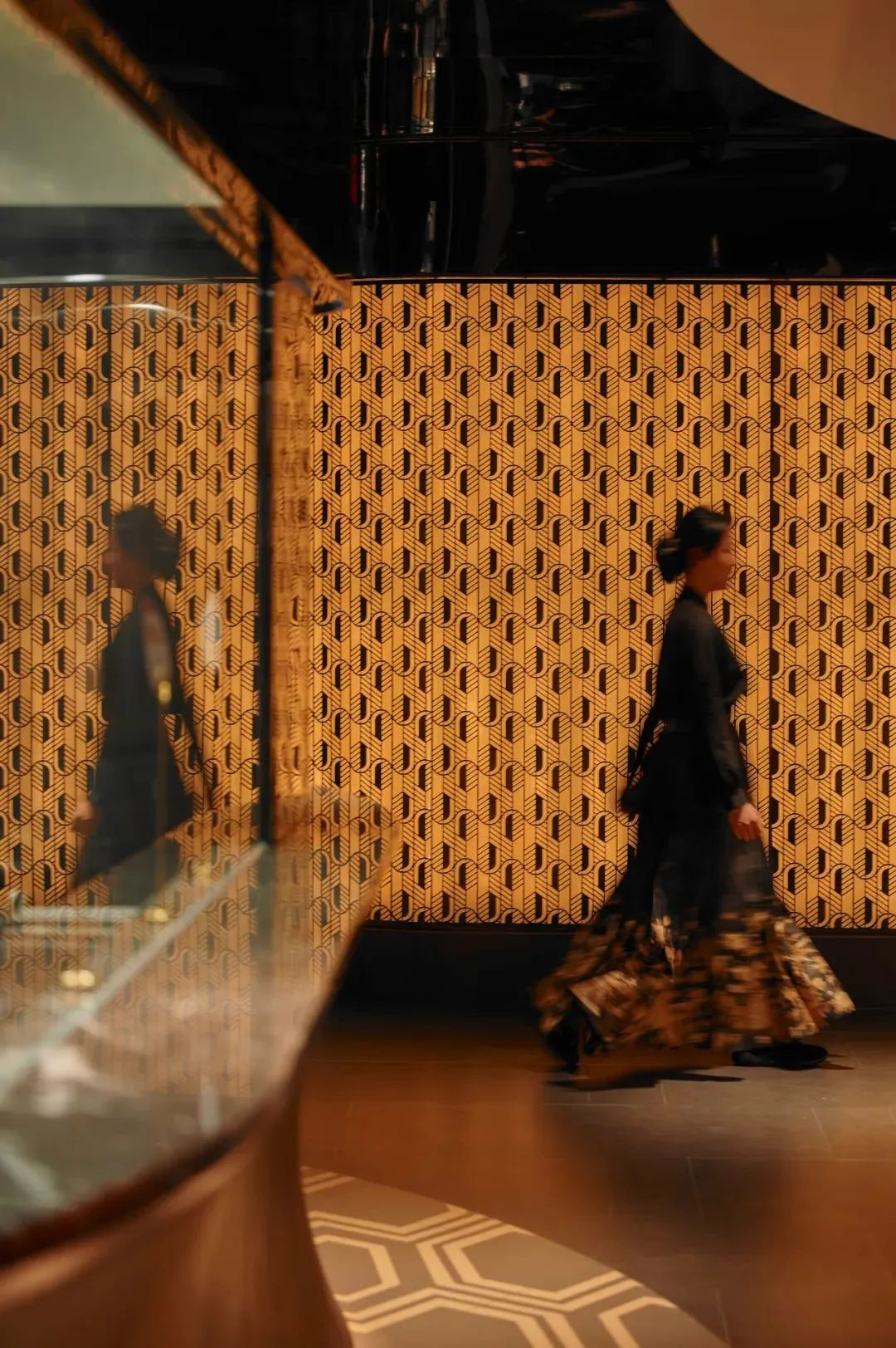 二楼过廊设计融入艺术浮雕与景观元素,赋予空间丰富的层次感,打破了过道的单调氛围。顶面采用镜面材质,缓解了低层高带来的压迫感。